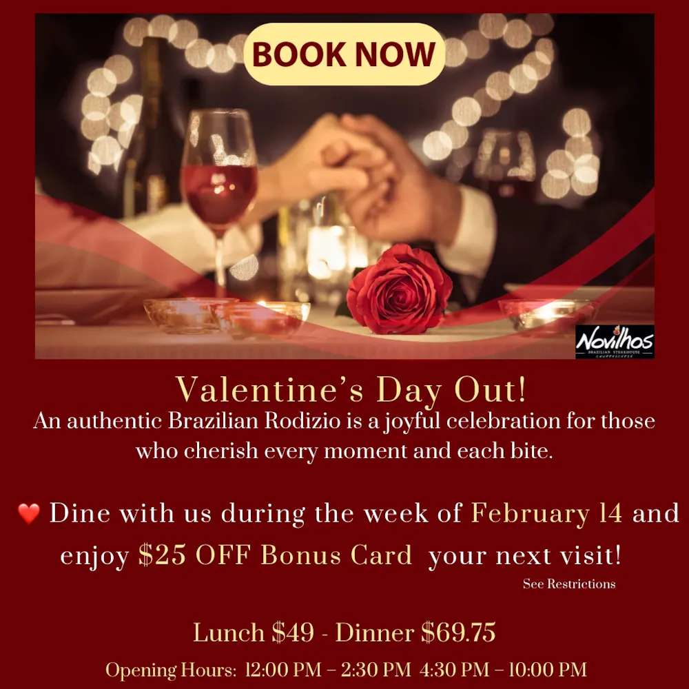 - To qualify for the $25 OFF bonus card, you must dine in during the week of Valentine’s Day and purchase a Full Rodizio Dinner.