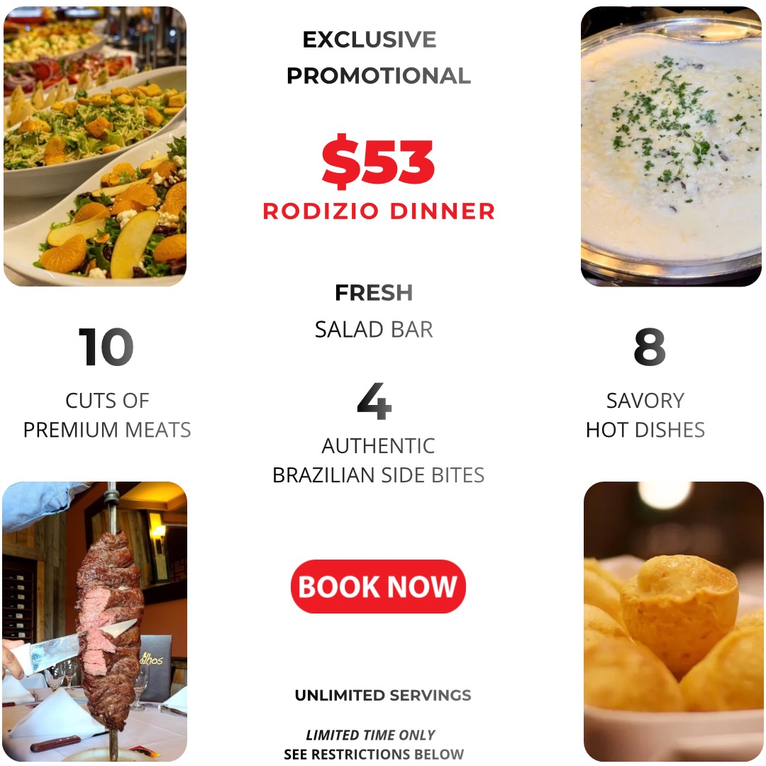 Enjoy the authentic flavors of Brazil with our limited-time promotion. For a special price of $53 per person, enjoy a selection of 10 fire-roasted meats, carved continuously at your table.